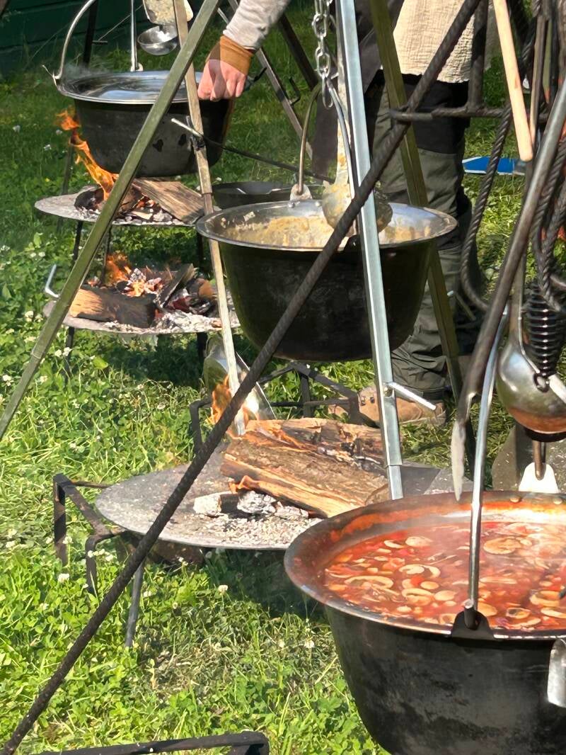 Er wordt een soep gemaakt en een heerlijke schotel met aardappels of rijst met groenten en vlees in een grote pan op het houtvuur.